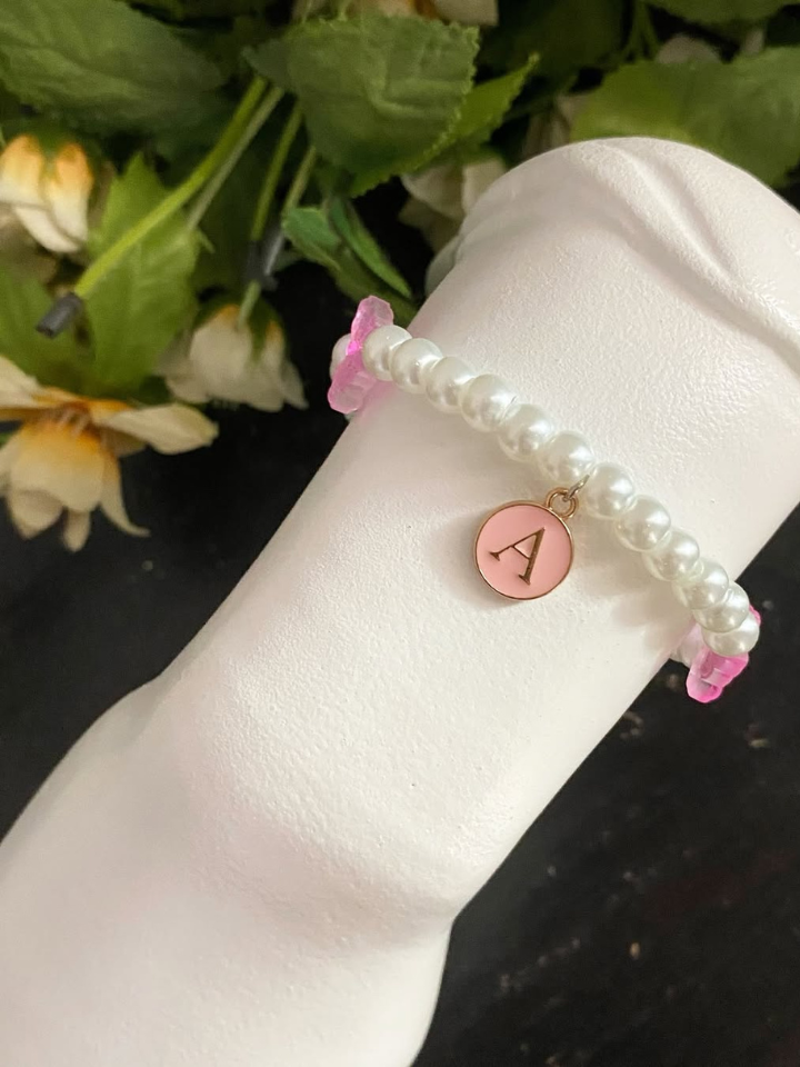Bracelet with a glittery pink butterfly charm and the letter A