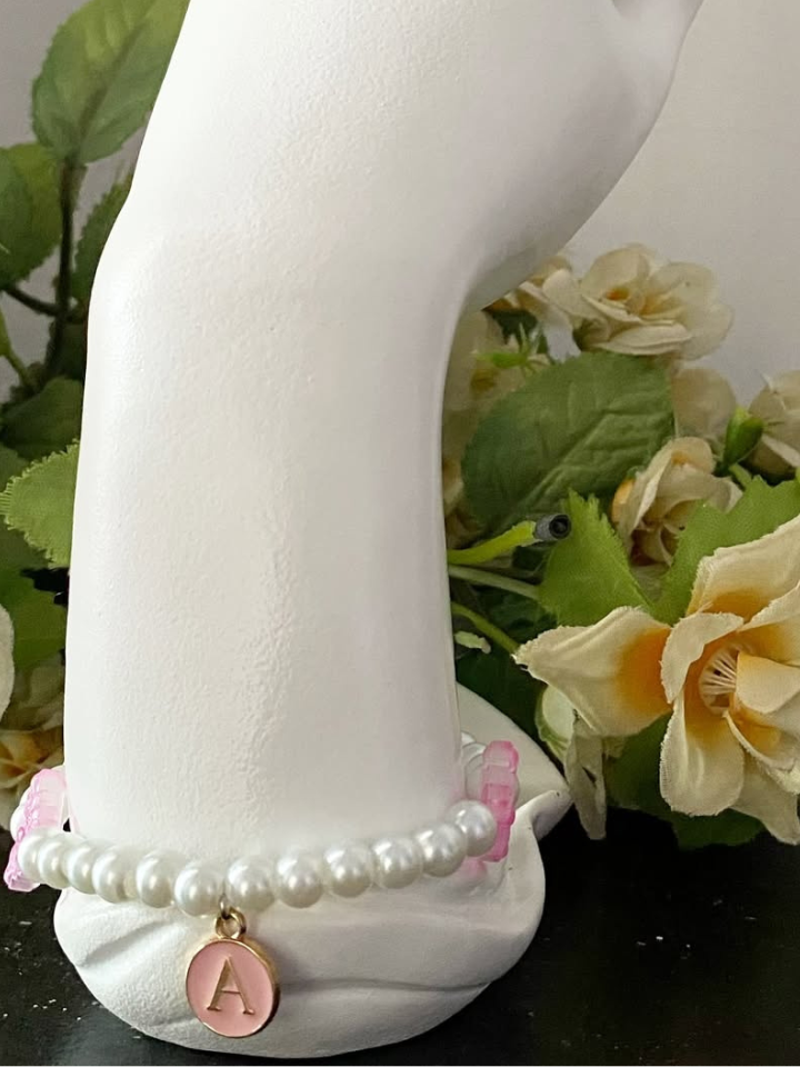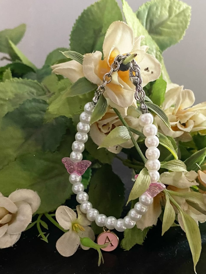 A custom made bracelet with a glittery pink butterfly charm and the letter A